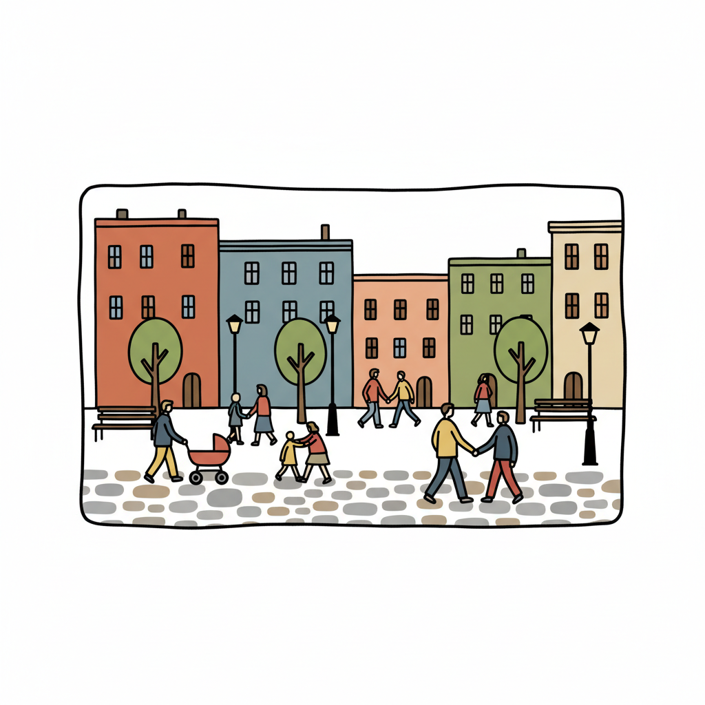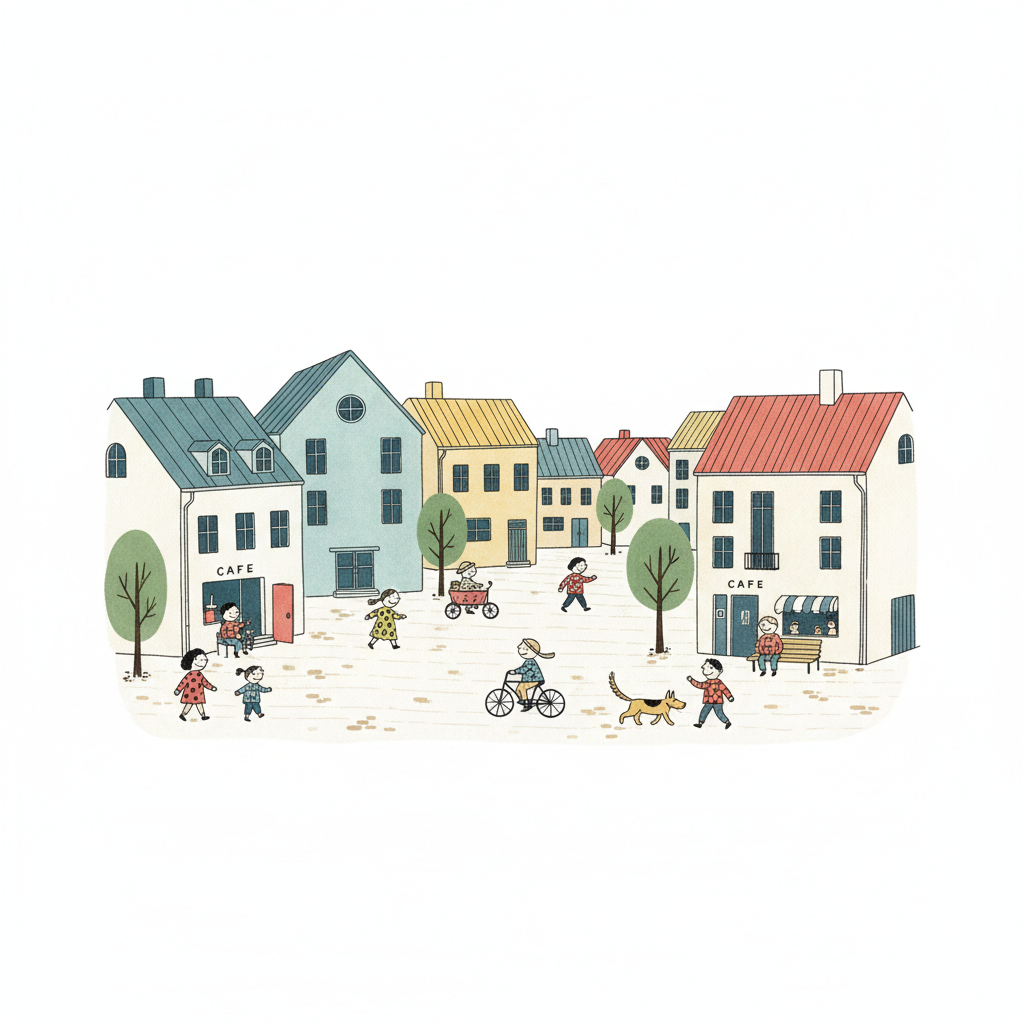 Idyllische Illustration eines Dorfplatzes mit spielenden Kindern, Häusern, Cafés und einem Hund.