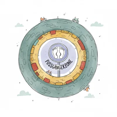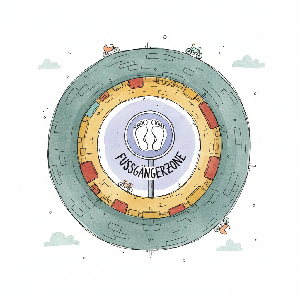 Kreisförmige Stadt-Illustration: Fußgängerzone im Zentrum, umgeben von Gebäuden und Radfahrern.
