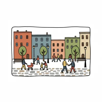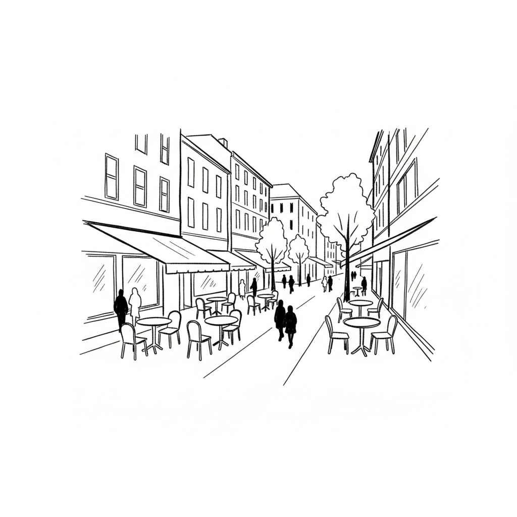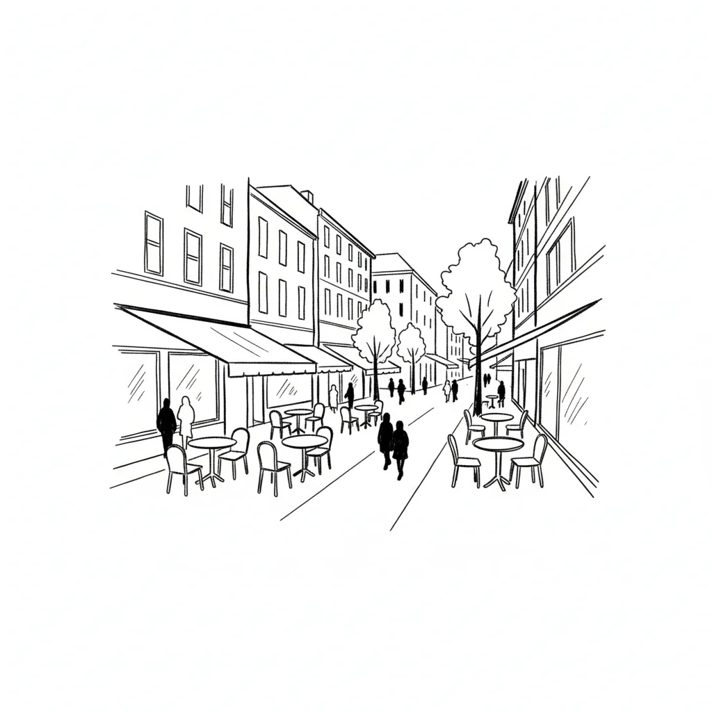 Schwarz-weiße Strichzeichnung einer belebten Stadtstraße mit Cafés, Gebäuden und Menschen.
