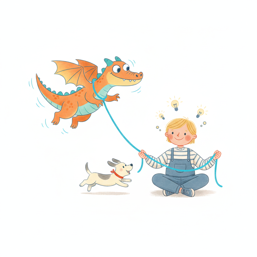 Kind mit leuchtenden Ideen hält fliegenden Drachen an der Leine, während ein Hund daneben rennt.