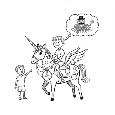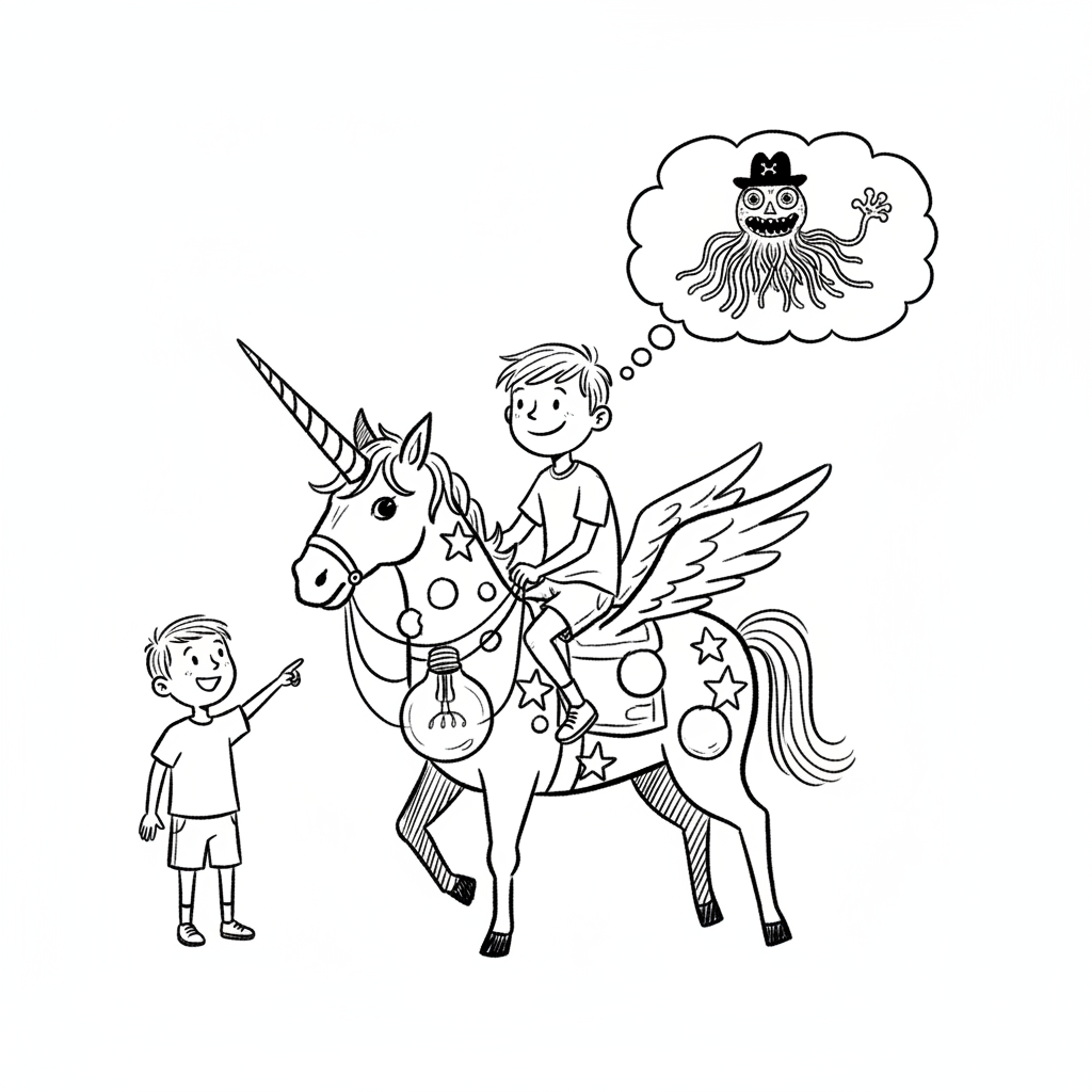 Ein Junge reitet ein geflügeltes Einhorn mit Glühbirne, träumt von einem Monster, ein anderer Junge schaut zu.
