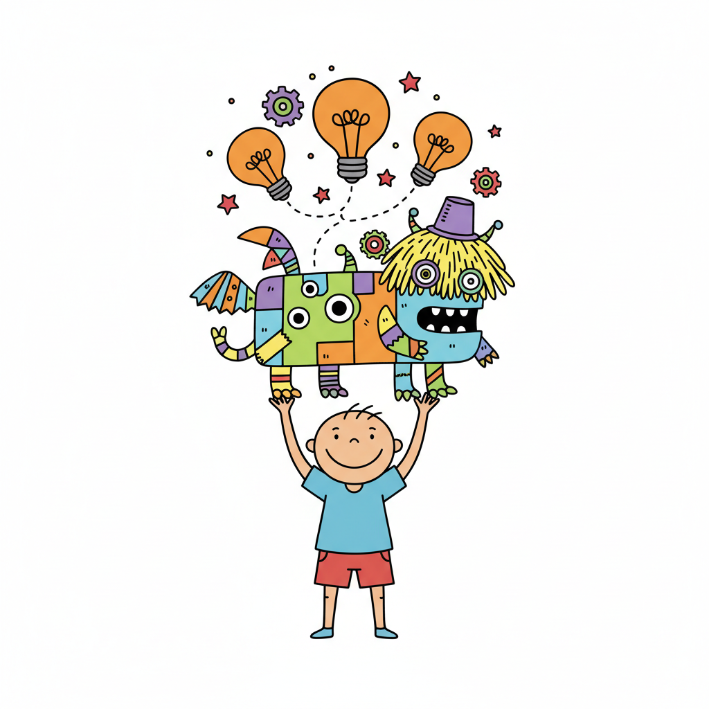 Ein lächelnder Junge hält ein buntes Fantasiemonster, über dem Glühbirnen als Ideen schweben.