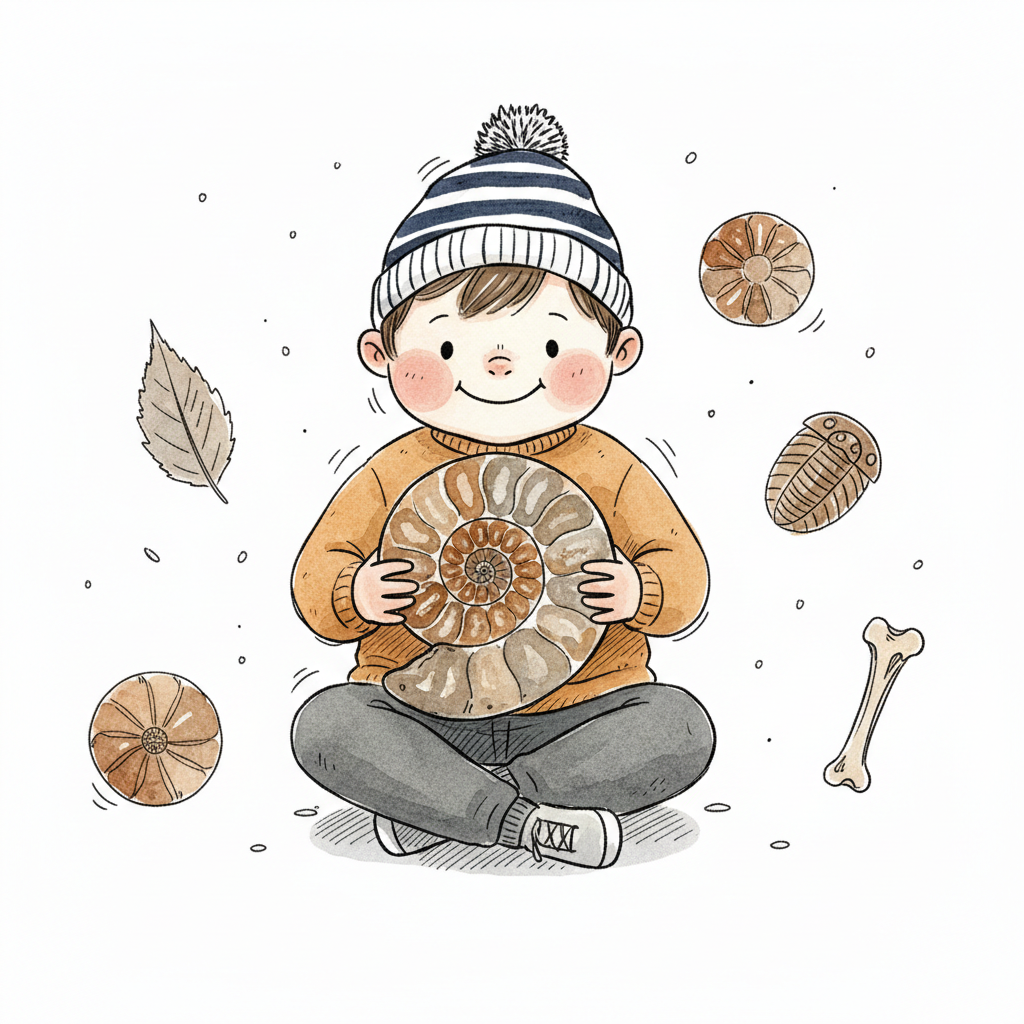 Niedliches Kind hält Ammonit, umgeben von Fossilien und Naturfunden. Aquarell-Illustration.