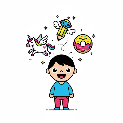 Fröhliches Cartoon-Kind mit fantasievollen Gedanken: Einhorn, Roboter-Bleistift, Donut.