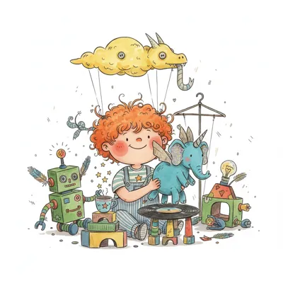 Ein fröhliches Kind mit roten Locken spielt fantasievoll mit einem Roboter, Elefanten und Drachenwolke.