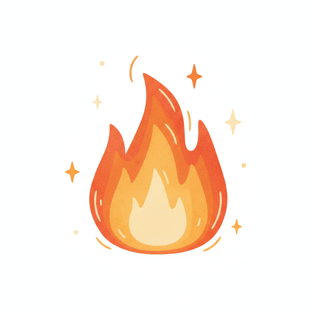 Eine leuchtende, stilisierte Flamme in warmen Farben, umgeben von kleinen Funkeln.