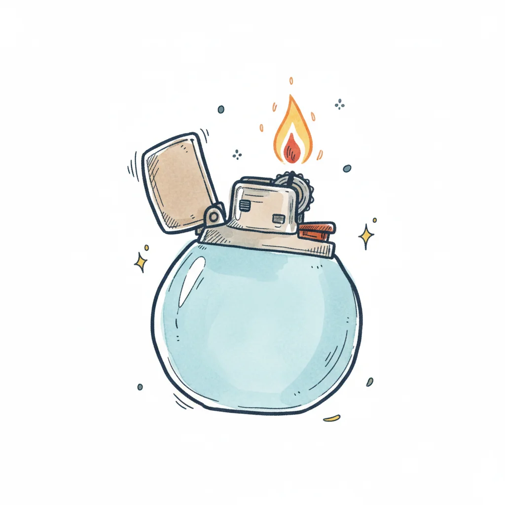 Niedliches, rundes blaues Feuerzeug mit offener Flamme und Funkeln im Cartoon-Stil.
