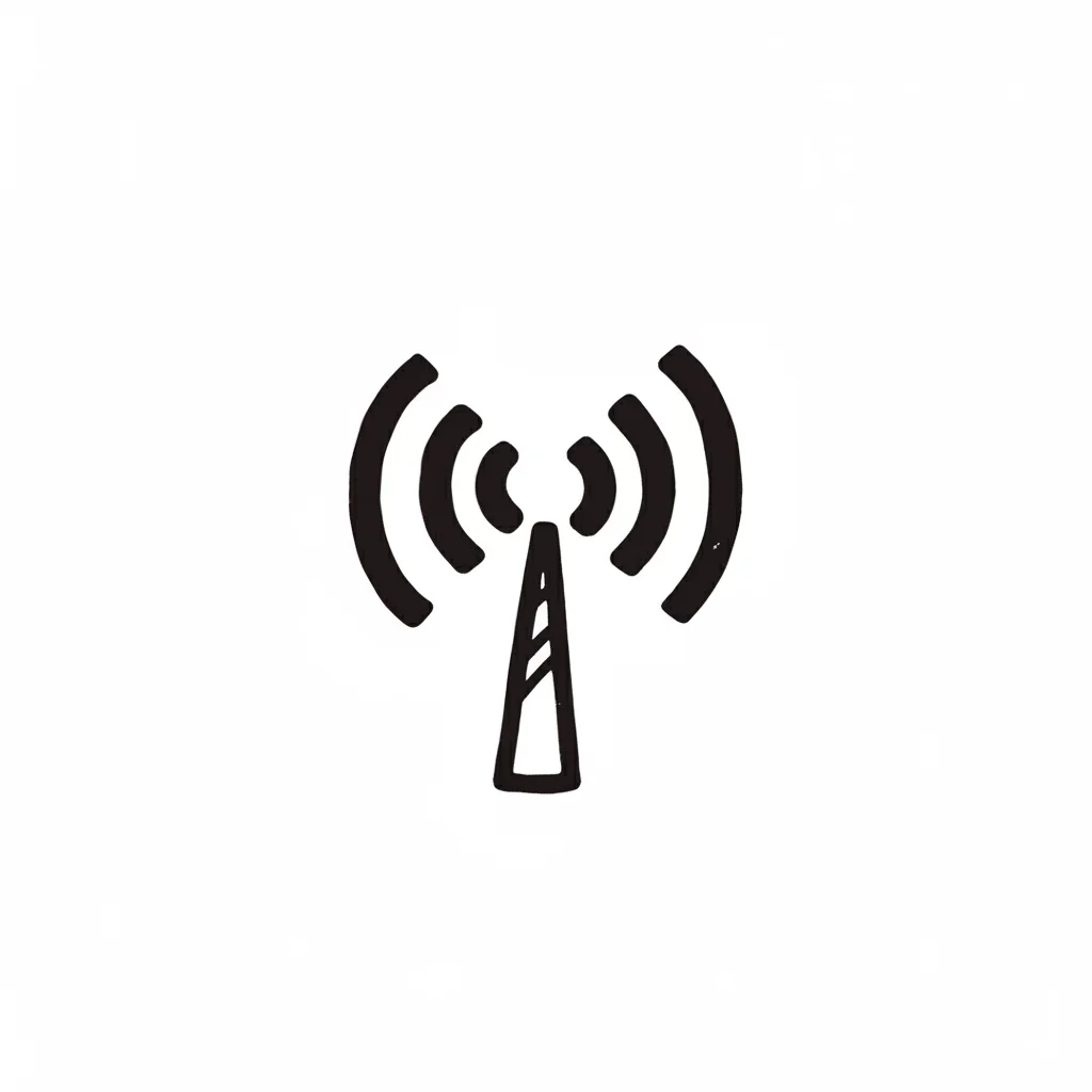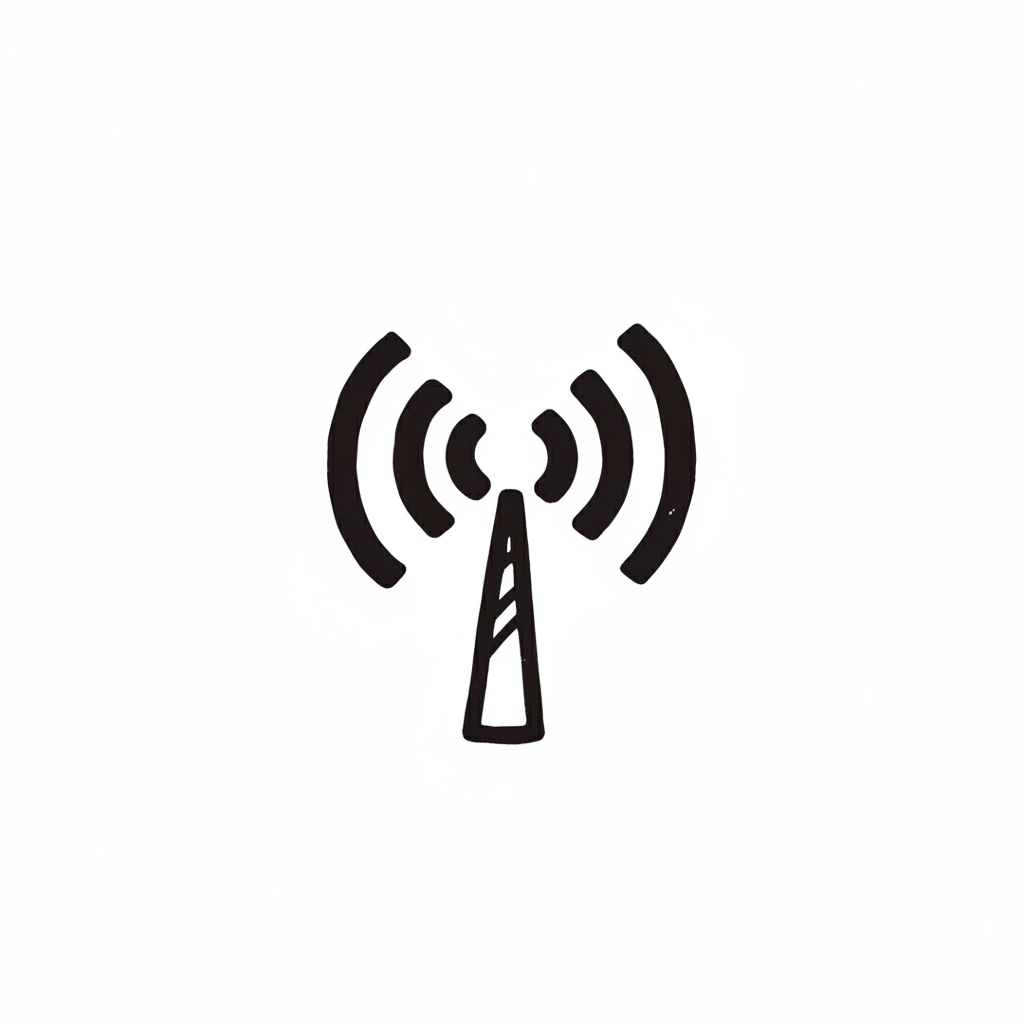 Schwarzes, handgezeichnetes Symbol einer Antenne mit Funkwellen auf weißem Hintergrund.