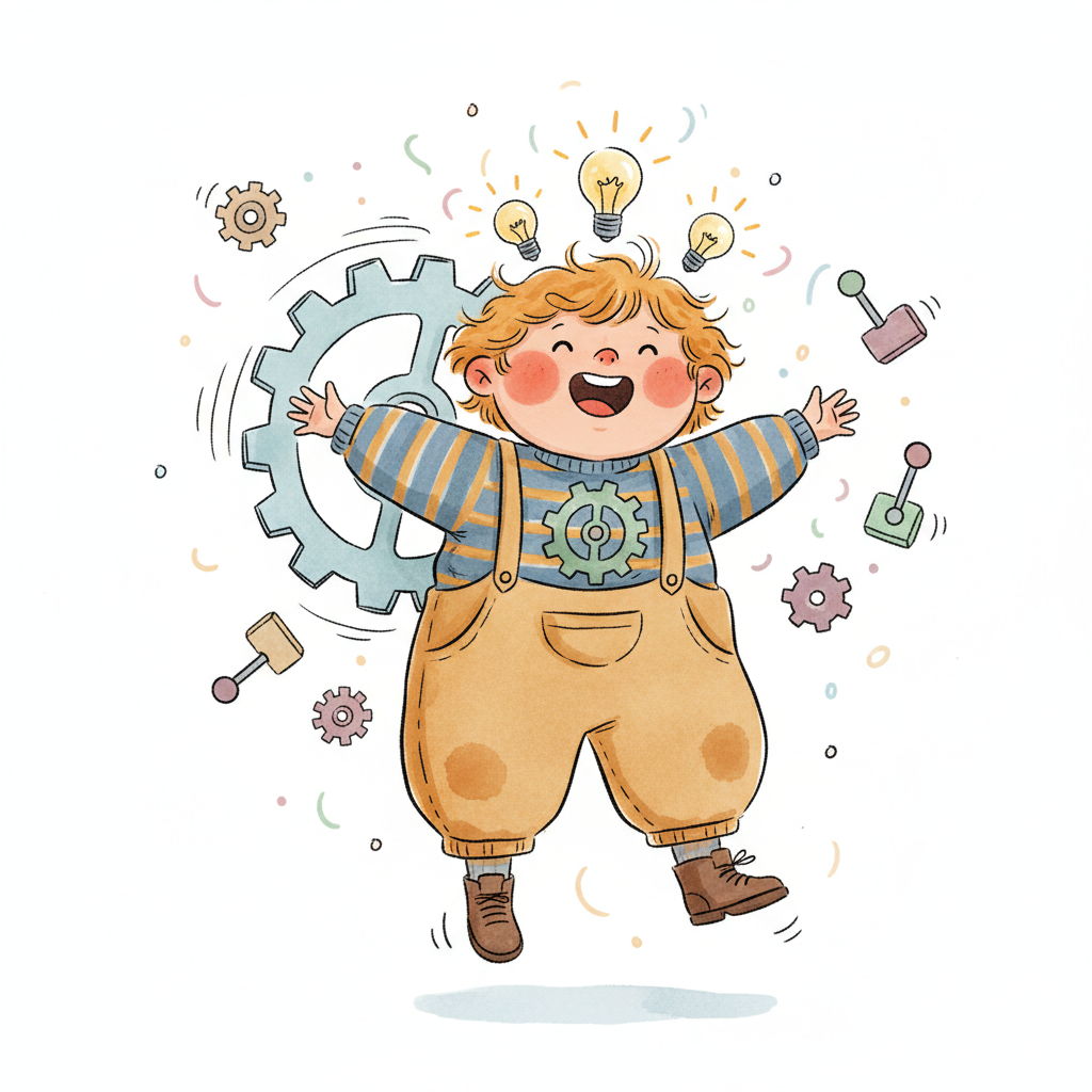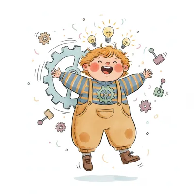 Fröhliches Kind springt, umgeben von Glühbirnen und Zahnrädern, symbolisiert Ideen und Technik.