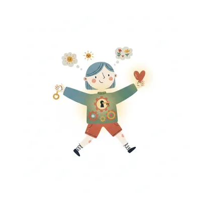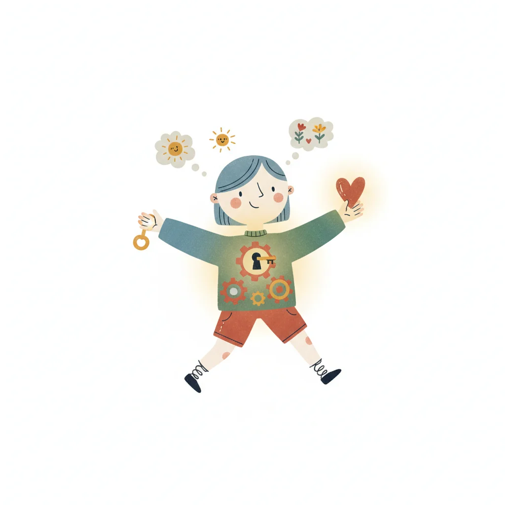 Glückliches Kind mit Schlüssel, Herz und Zahnrädern, das über Sonne und Blumen nachdenkt.