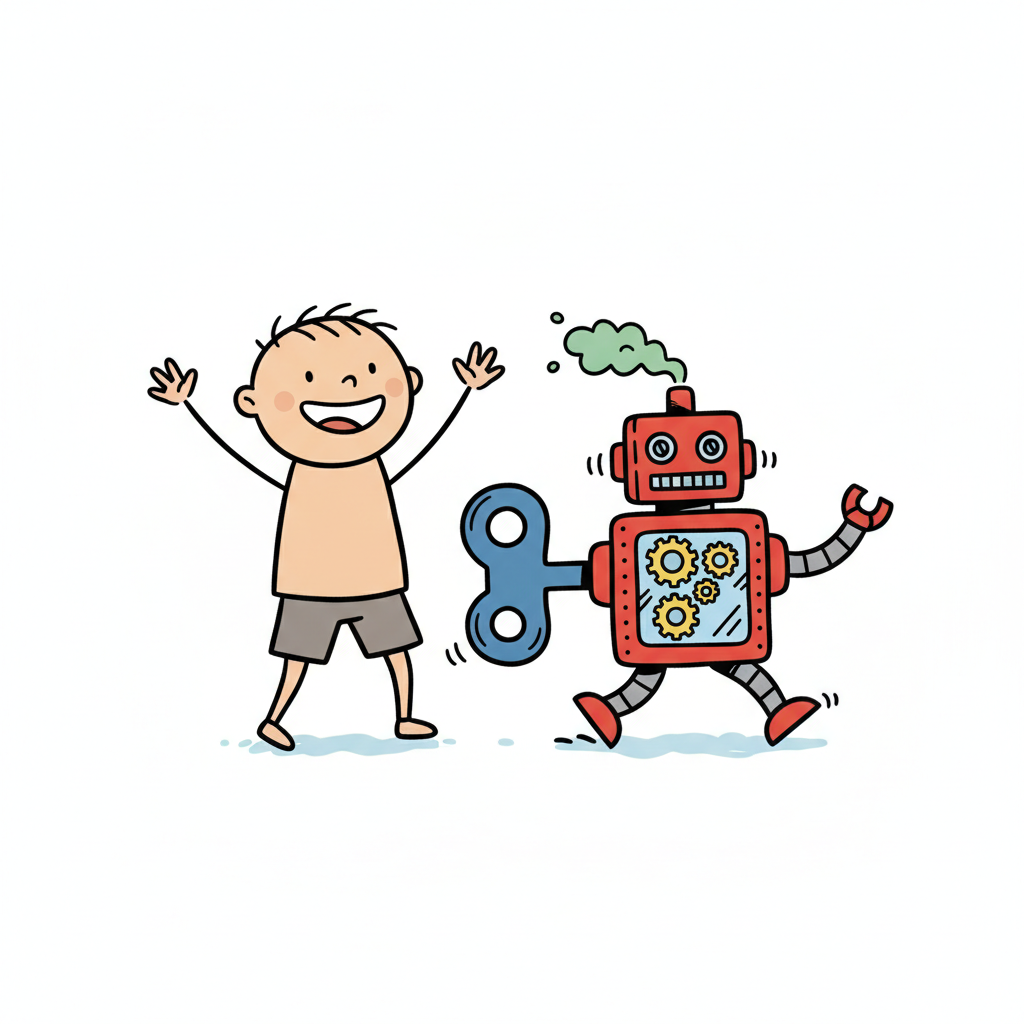 Fröhlicher Junge mit erhobenen Armen neben einem roten Aufziehroboter, der Rauch ausstößt.