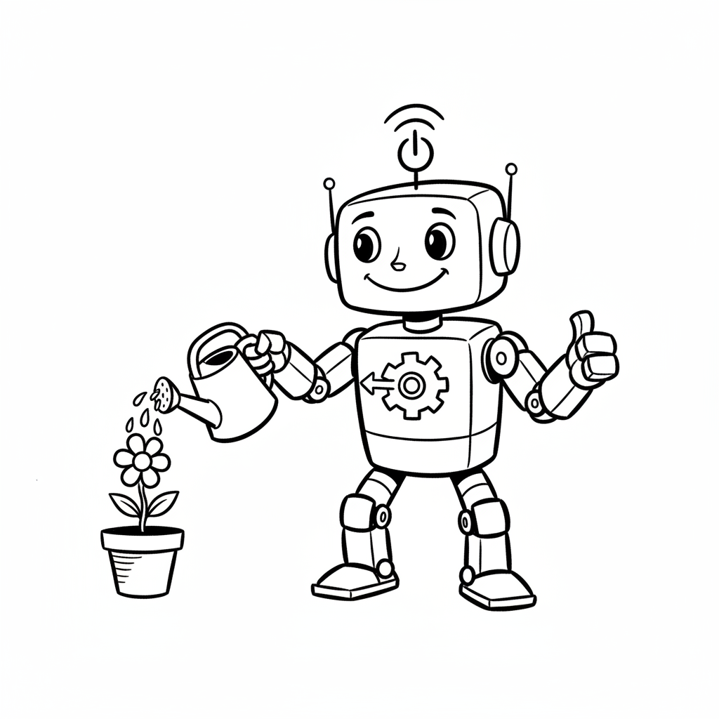 Ein freundlicher Roboter gießt eine Blume und gibt einen Daumen hoch. Schwarz-weiß Cartoon.