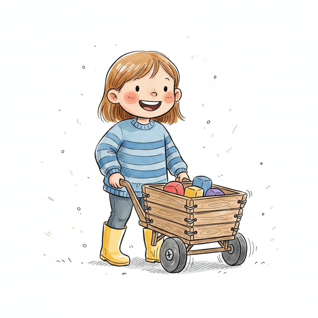Fröhliches Mädchen schiebt einen Holzwagen voller bunter Bauklötze.