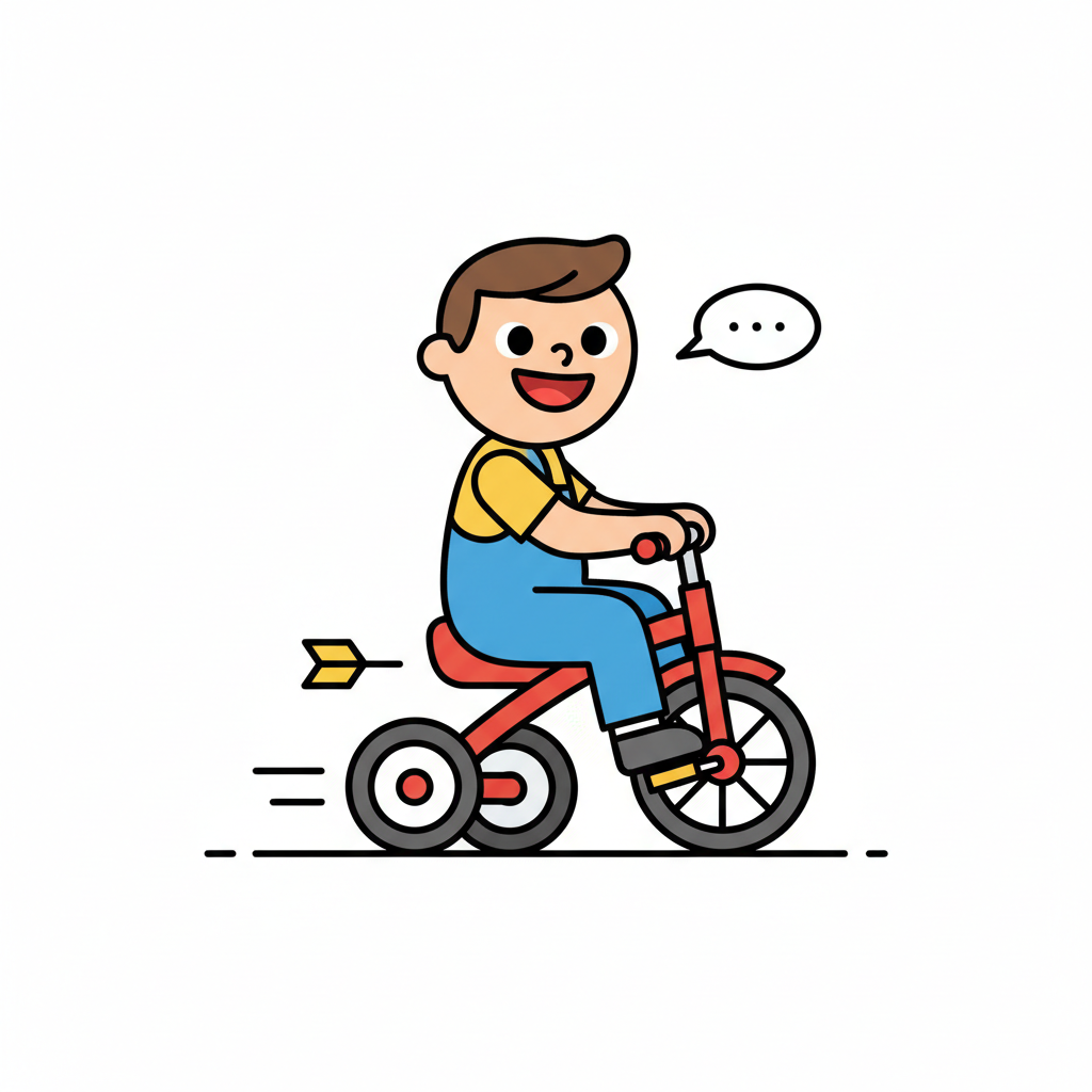 Fröhlicher Cartoon-Junge in Latzhose fährt schnell auf einem roten Dreirad mit Sprechblase.