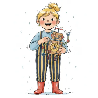 Fröhliches Kind in Latzhose hält einen selbstgebauten Holzroboter mit Zahnrädern.