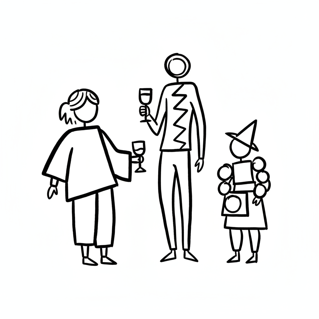 Strichmännchen-Gruppe: Zwei Erwachsene mit Weingläsern, ein Kind im Kostüm mit Hut.