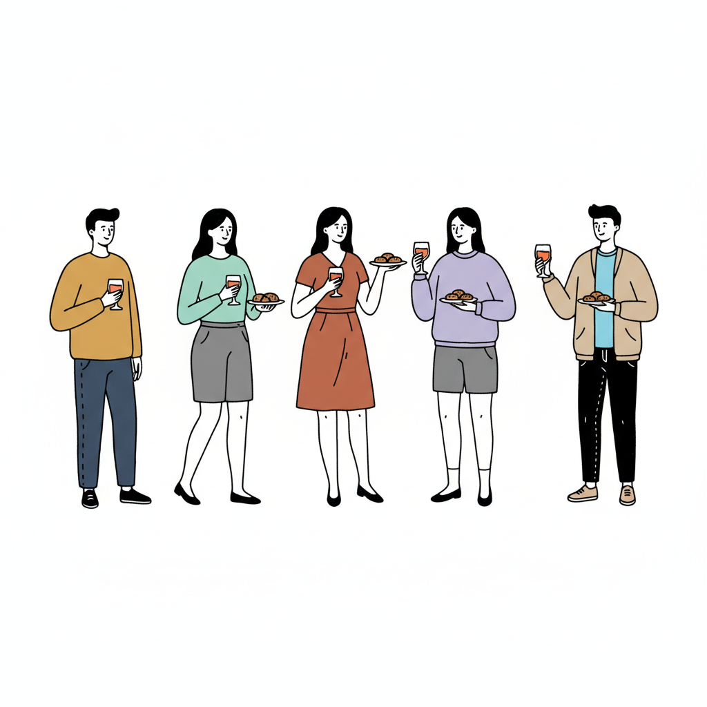 Fünf Personen (3 Frauen, 2 Männer) stehen mit Weingläsern und Snacks beisammen. Eine minimalistische Illustration.