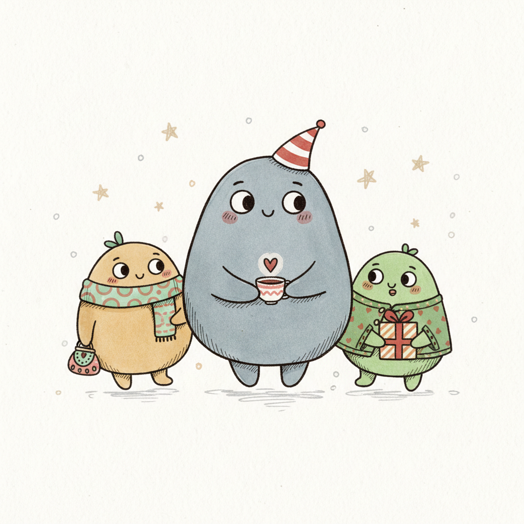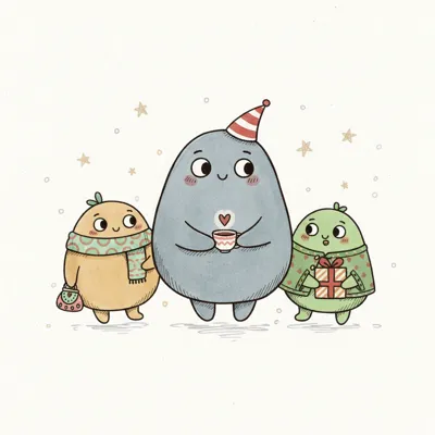 Drei fröhliche, runde Freunde in festlicher Stimmung mit Geschenken und Kakao.