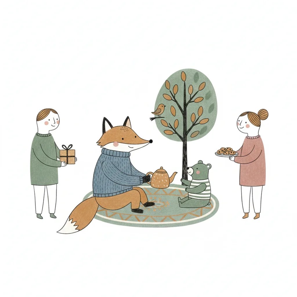 Niedliche Illustration von Tieren und Kindern bei einem Picknick mit Geschenken und Tee.