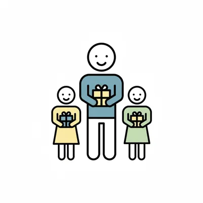 Drei lächelnde Personen, ein Erwachsener und zwei Kinder, halten Geschenke. Fröhliche Familie.
