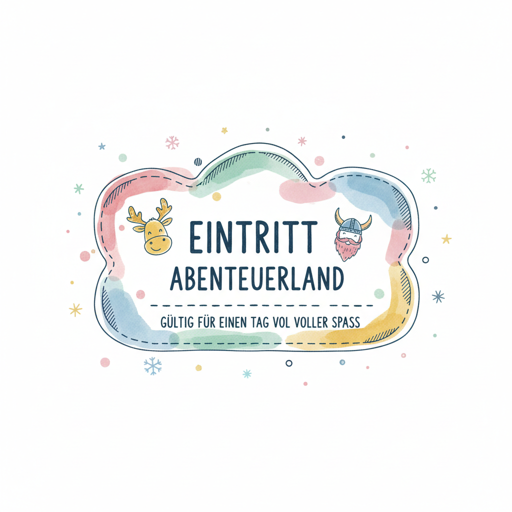Bunter Gutschein für "Eintritt Abenteuerland" mit Rentier und Wikinger, gültig für einen Tag Spaß.