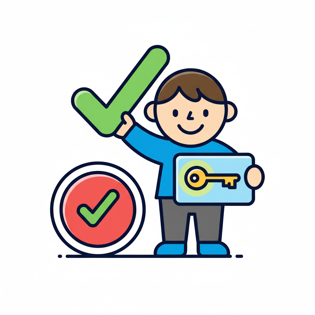 Cartoonfigur hält grünen Haken und Schlüsselkarte, daneben ein Bestätigungssymbol.