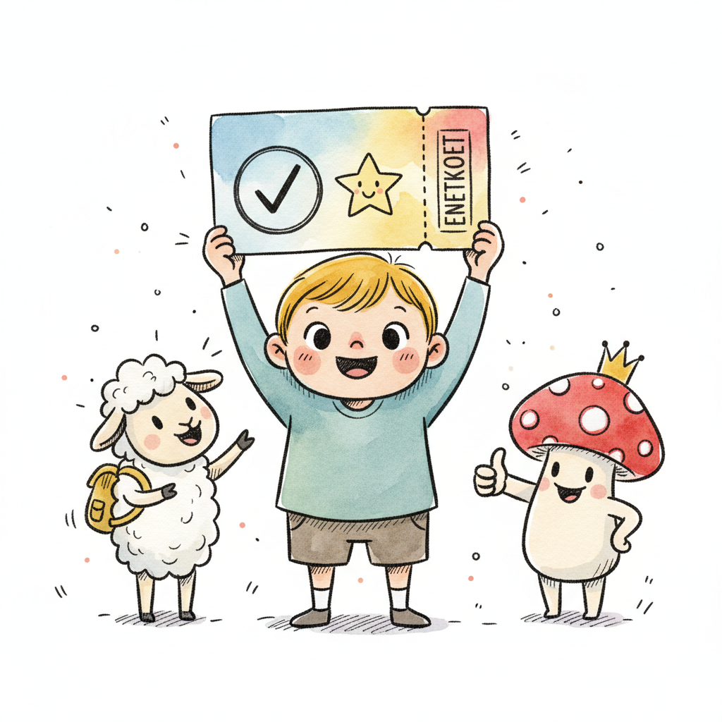 Glücklicher Junge präsentiert Ticket, daneben ein Schaf und ein Pilz mit Krone.