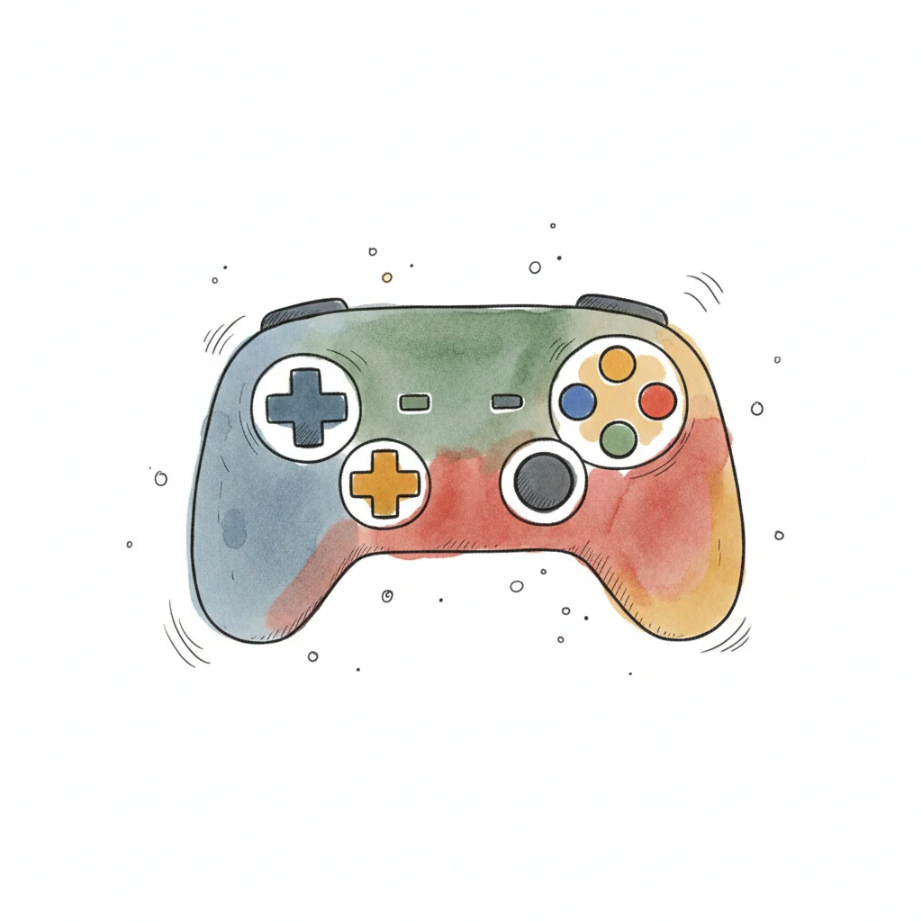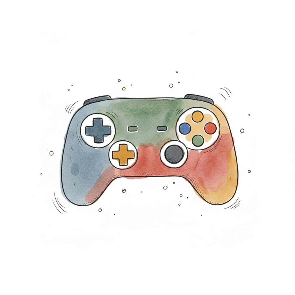 Bunter Gamecontroller in Aquareell-Optik, handgezeichnet mit leichten Spritzern.