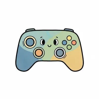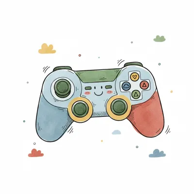 Niedlicher, farbenfroher Gamecontroller mit lächelndem Gesicht im Cartoon-Stil und Aquarell-Optik.