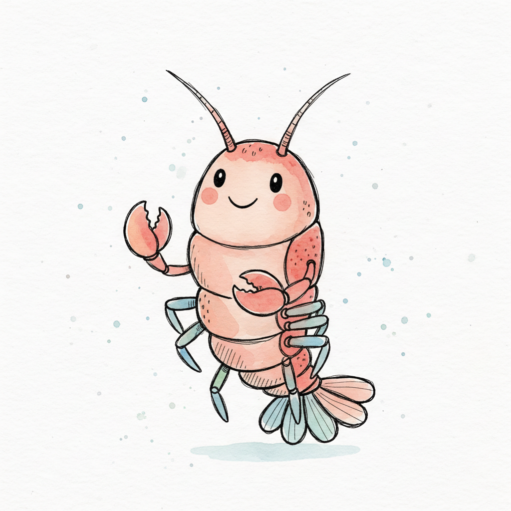 Ein einfach gezeichneter, rosa Garnele mit langen Antennen.
