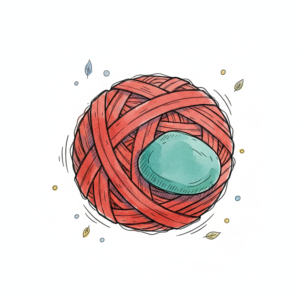 Aquarell-Illustration eines roten Garnknäuels mit einem türkisfarbenen Ei, umgeben von kleinen Blättern.