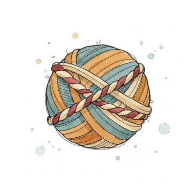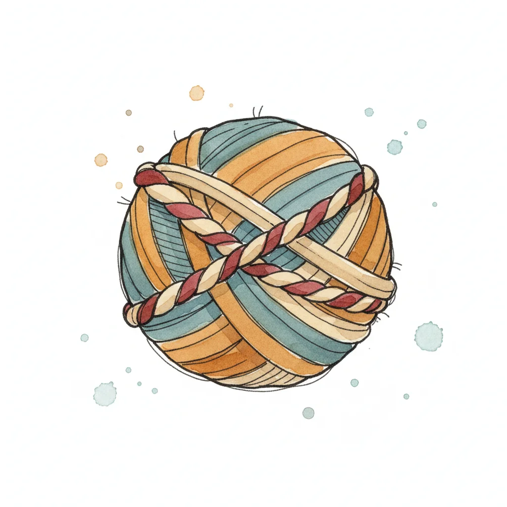Aquarell-Illustration eines bunten Garnknäuels mit geflochtenem Seil umwickelt.