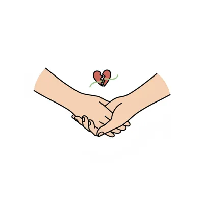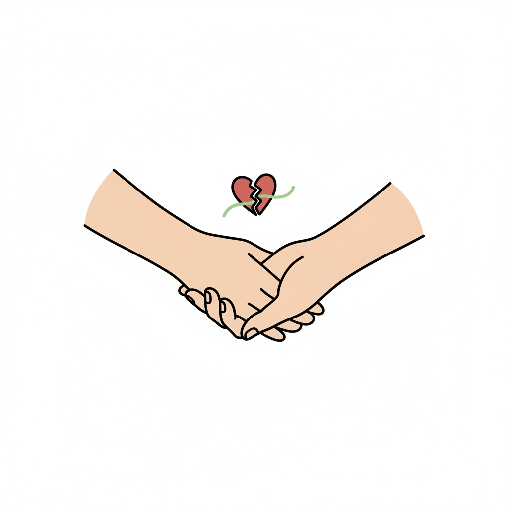 Hände halten sich, während ein gebrochenes Herz mit einem Faden geflickt wird.