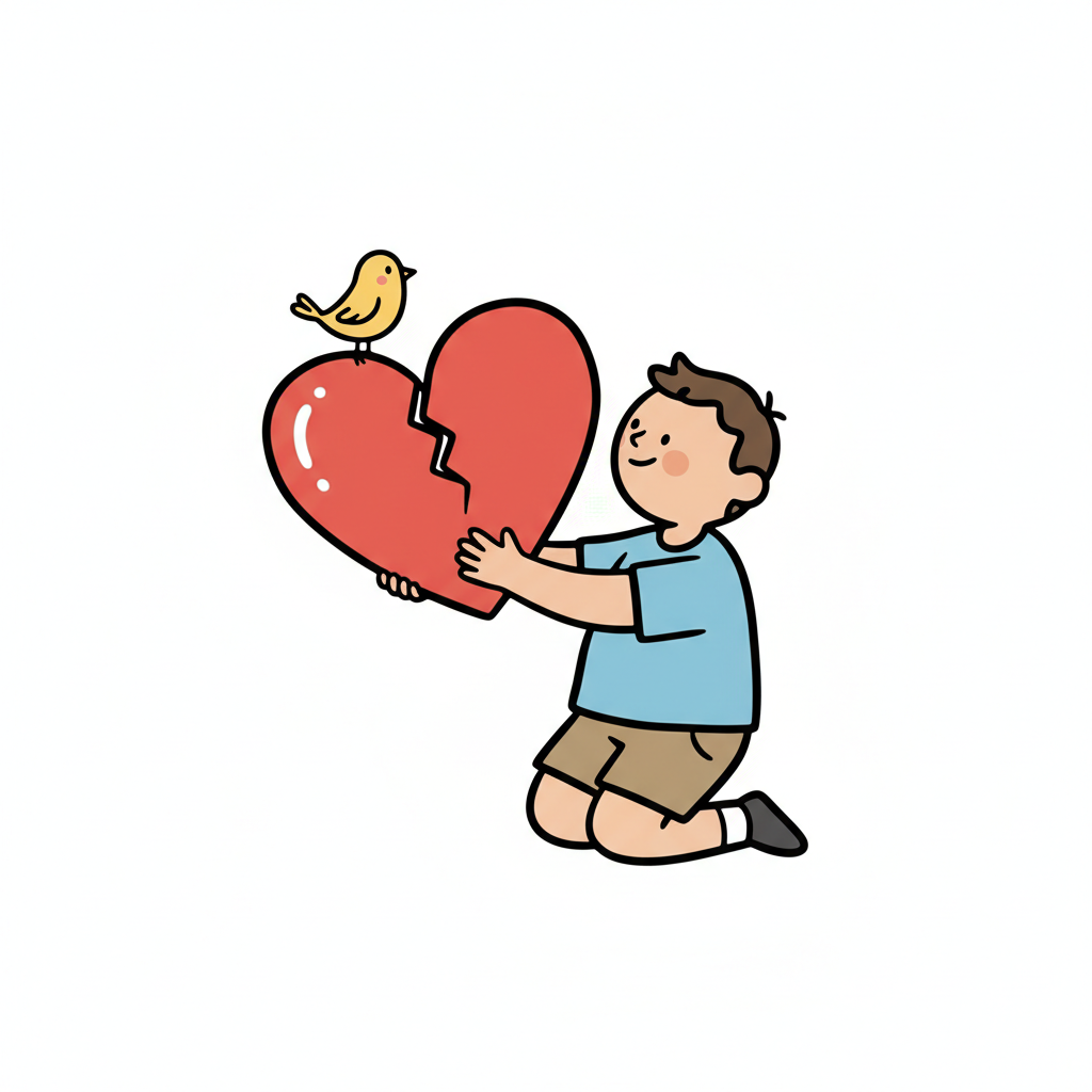 Ein lächelnder Junge kniet und hält ein gebrochenes Herz, auf dem ein kleiner Vogel sitzt.