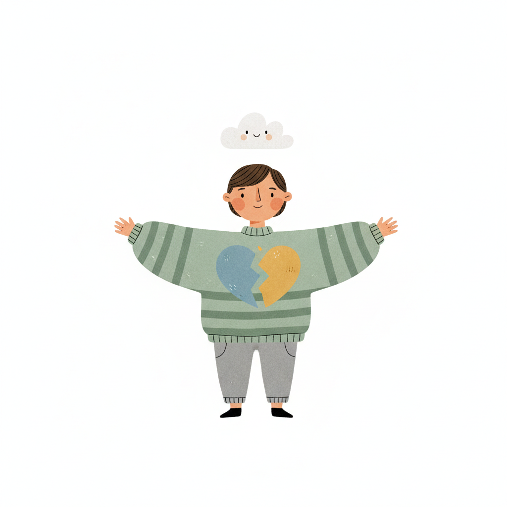 Cartoonfigur mit gebrochenem Herz auf Pullover und lächelnder Wolke über dem Kopf.