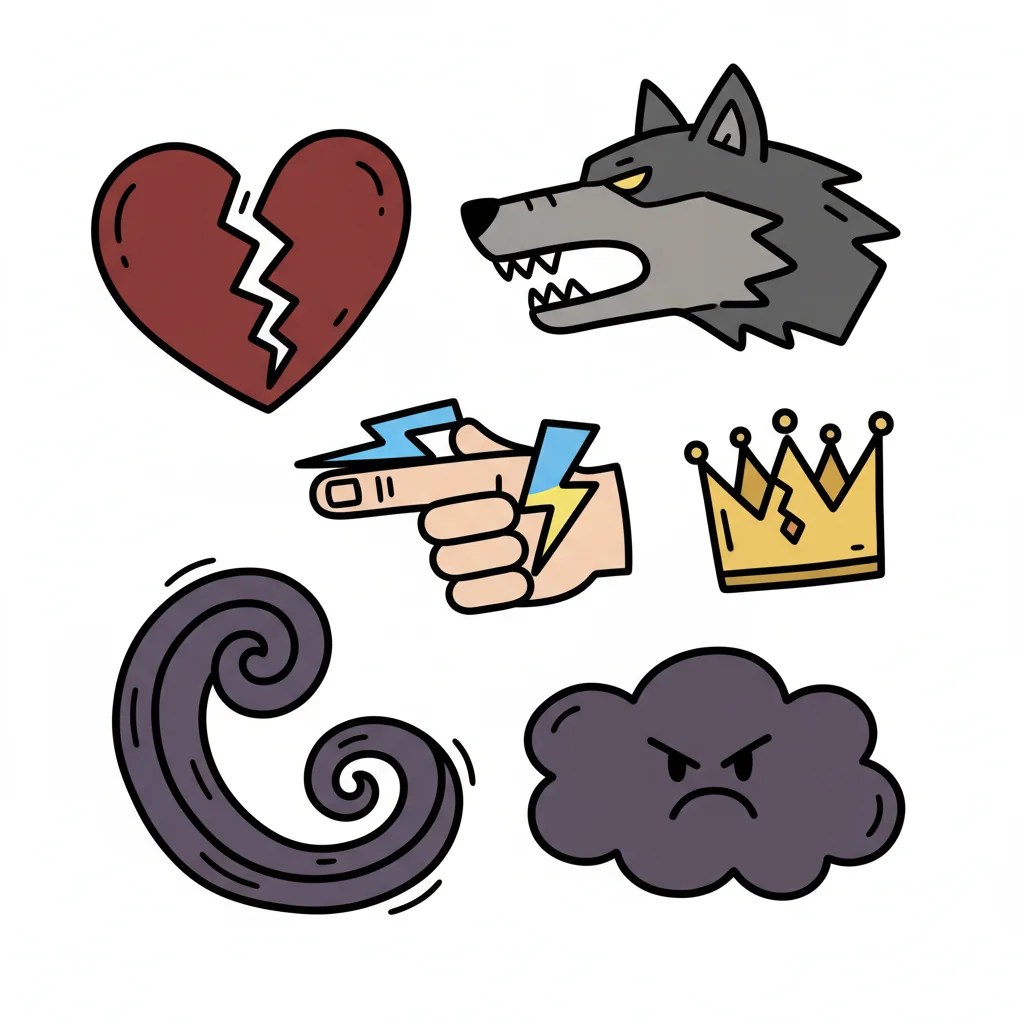 Eine Sammlung von Doodle-Symbolen: gebrochenes Herz, Wolf, Blitzhand, Krone, Wirbel, wütende Wolke.