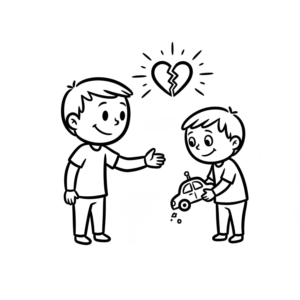 Ein Junge tröstet einen anderen Jungen, der ein kaputtes Spielzeugauto hält. Gebrochenes Herz.