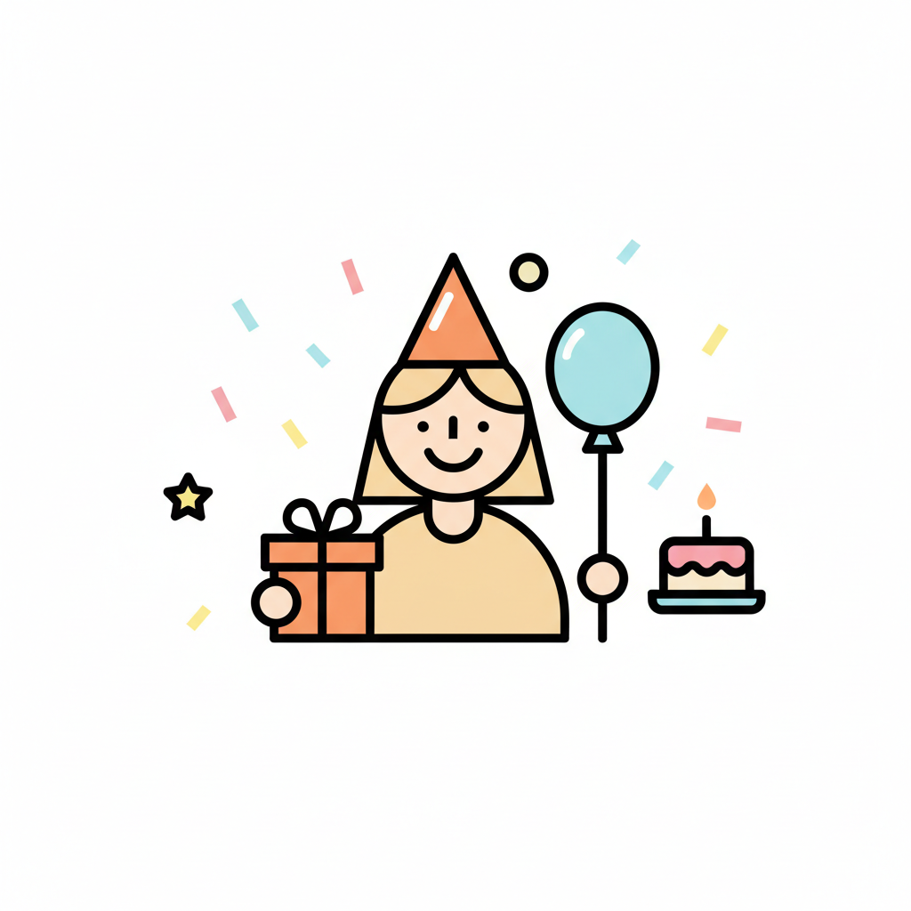 Glückliche Person mit Partyhut, Geschenk, Ballon und Geburtstagstorte, umgeben von Konfetti.