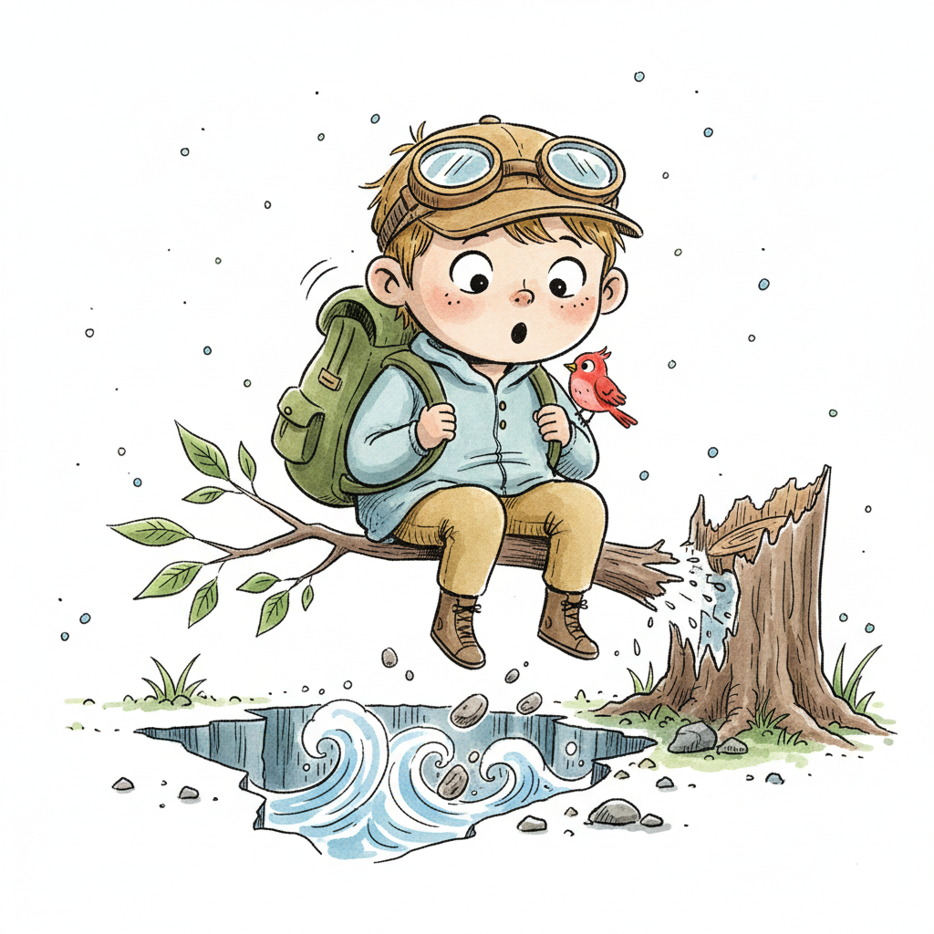 Junge mit Rucksack und Vogel sitzt auf Ast, überrascht von Wasserloch und kaputtem Baumstumpf.