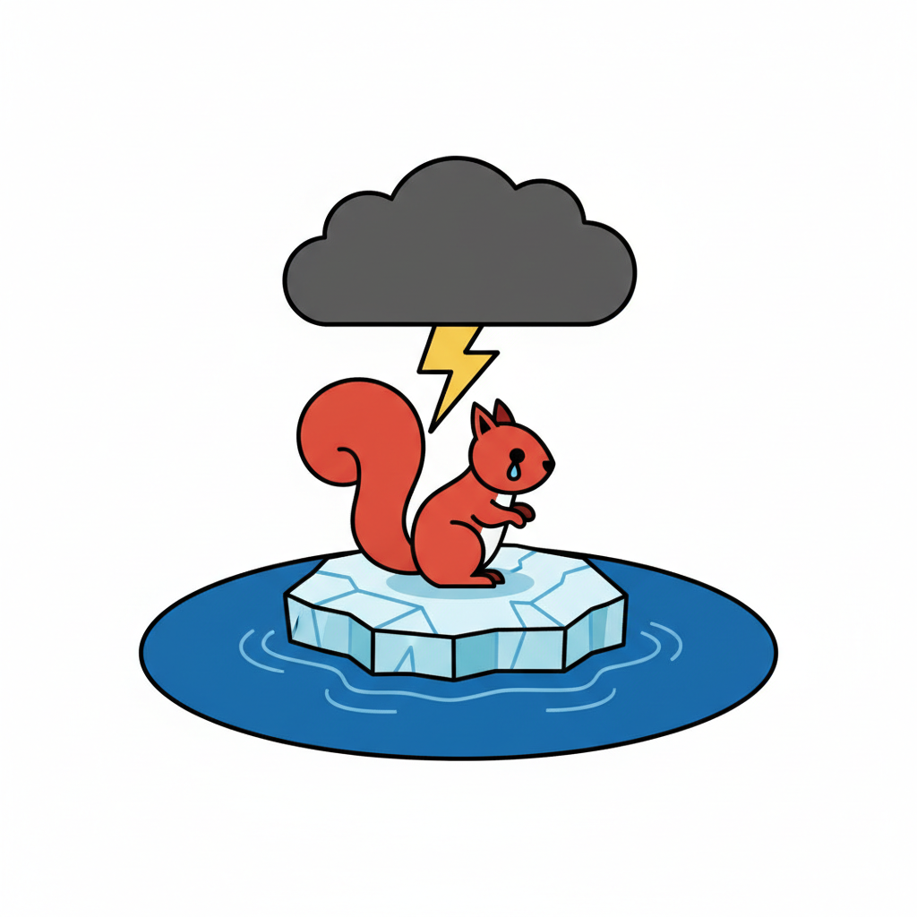 Trauriges Eichhörnchen auf schmelzender Eisscholle unter Gewitterwolke, symbolisiert Klimawandel.