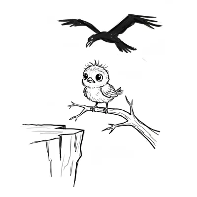 Ein Küken sitzt am Klippenrand, während ein großer Vogel darüber fliegt. Lernflug.