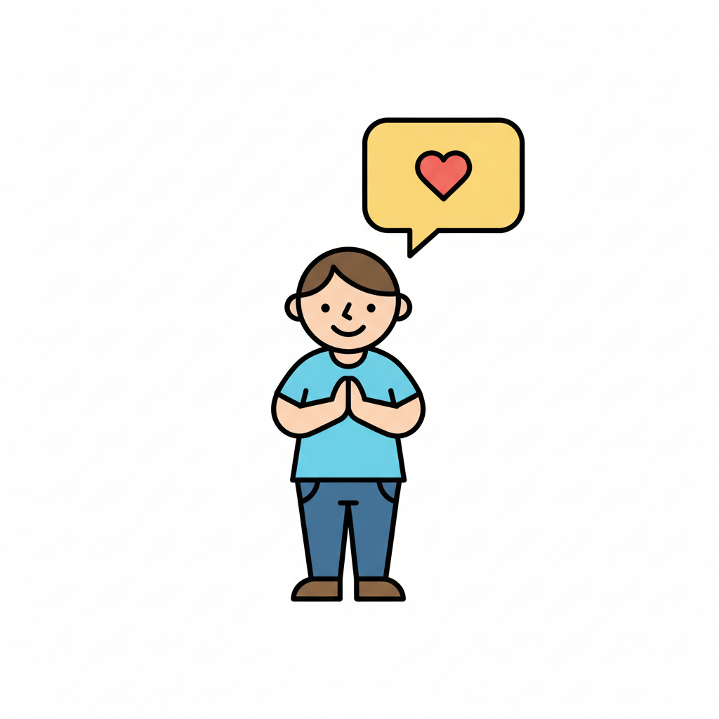 Ein süßes Kind mit gefalteten Händen und Herzsymbol im Sprechblasen.