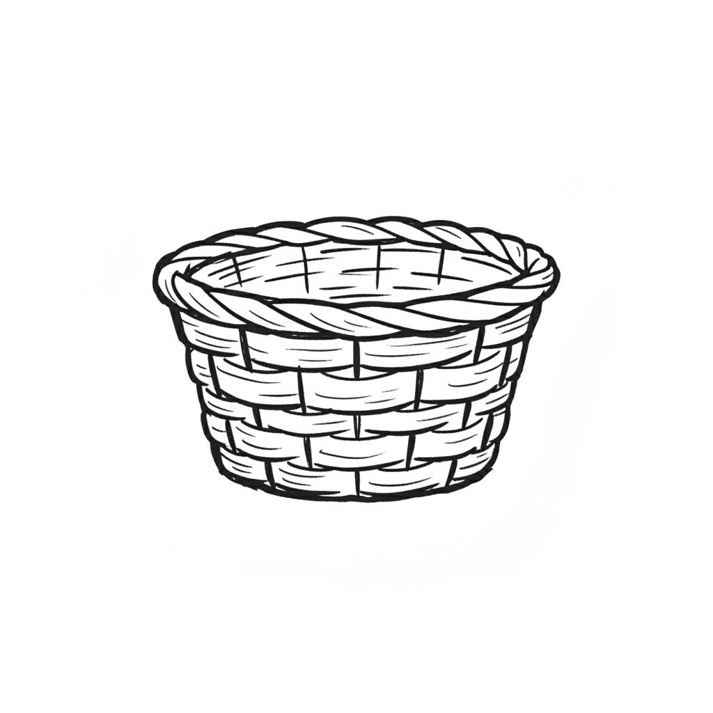 Einfache, schwarz-weiße Zeichnung eines leeren, runden Korbs.