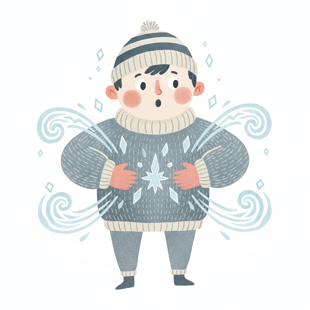 Cartoon-Junge in Mütze und Pullover friert, umgeben von eisigen Wirbeln.