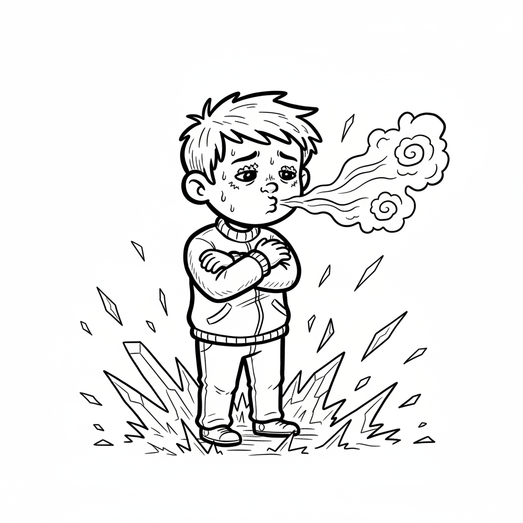 Frierender Junge mit sichtbarem Atem und Eissplittern, schwitzt vor Kälte. Schwarz-weiß-Cartoon.