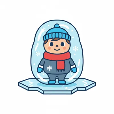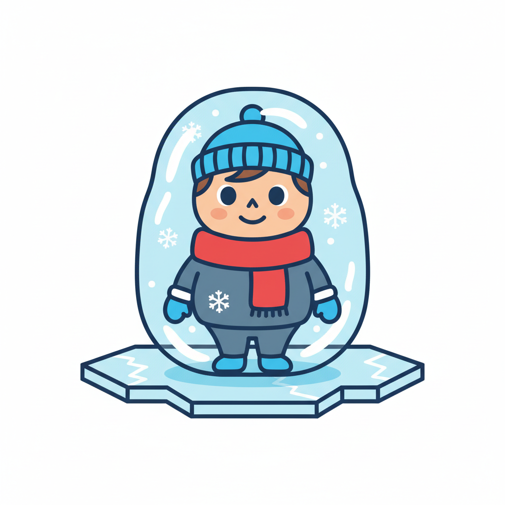Niedlicher Cartoon-Junge in Winterkleidung, gefangen in einer Eisblase auf einer Eisscholle.
