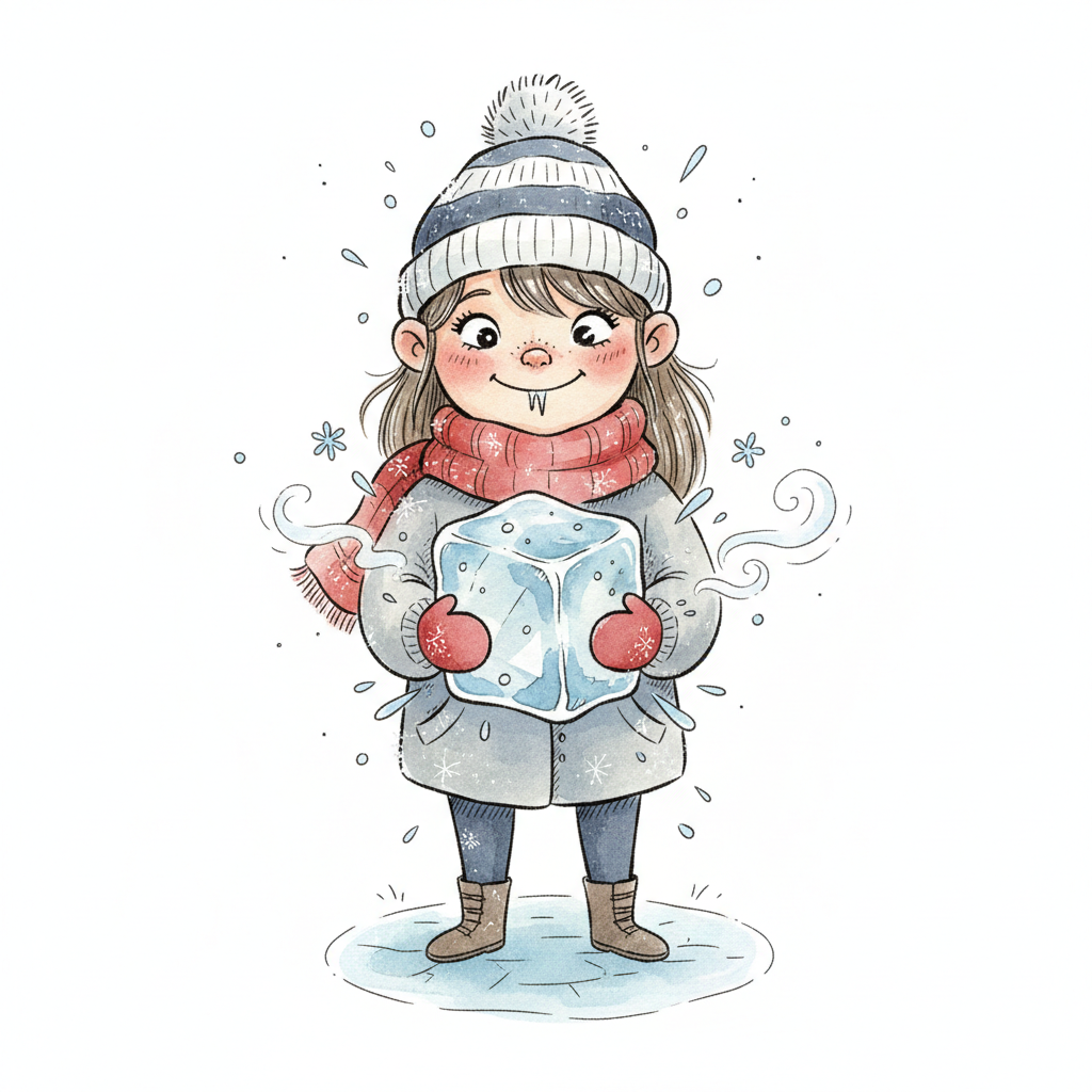 Ein Cartoon-Mädchen in Winterkleidung hält einen großen Eiswürfel und sieht fröhlich aus.