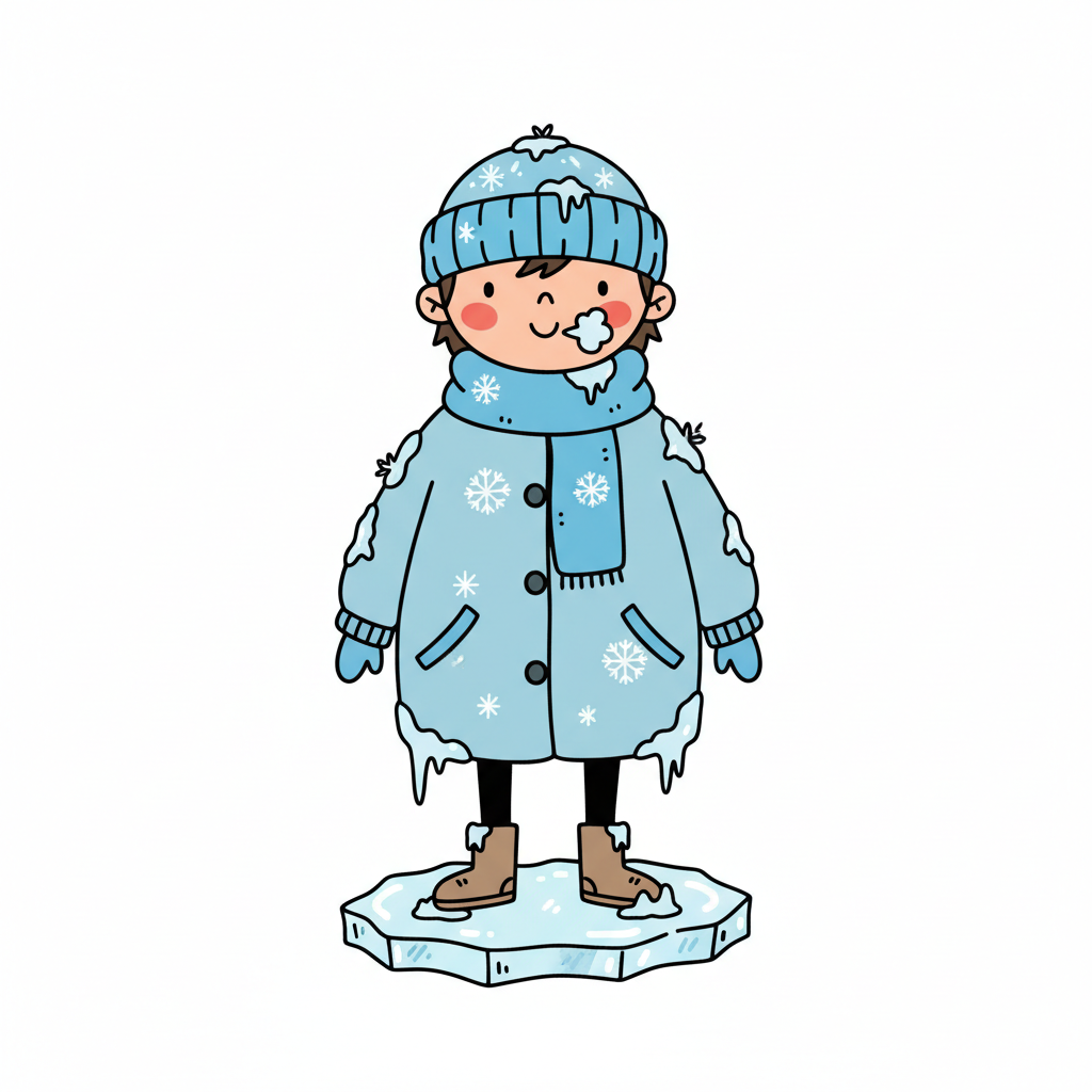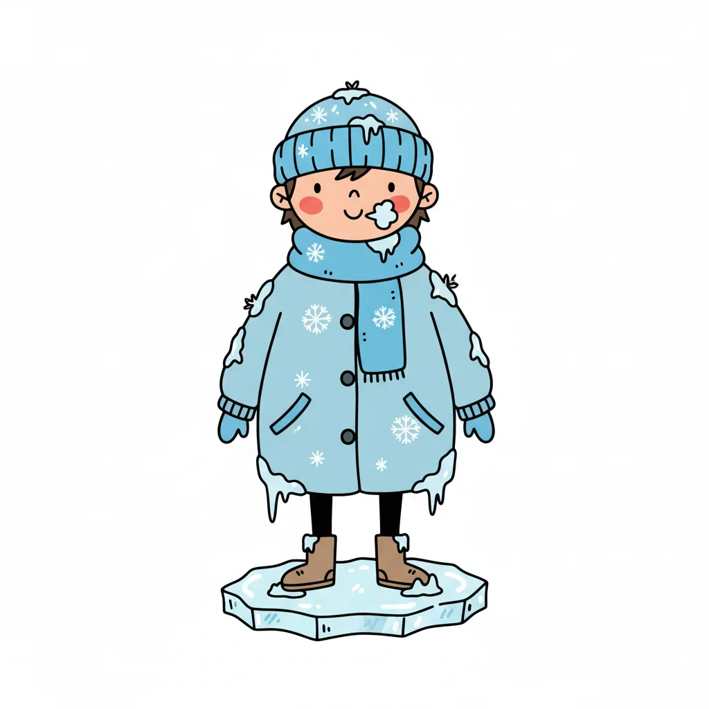Cartoon-Kind in Winterkleidung, bedeckt mit Schnee und Eis, steht auf einer Eisscholle.