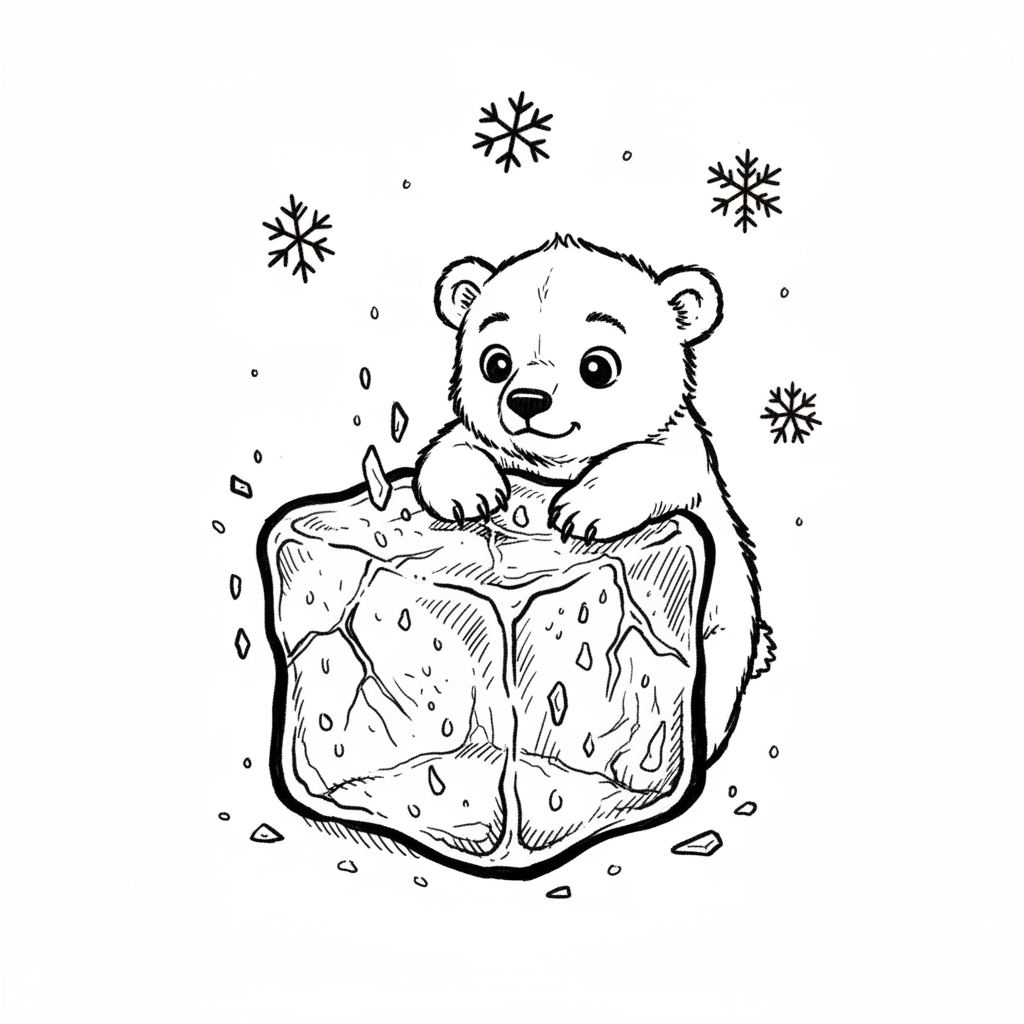 Ein süßes Eisbärenjunges spielt mit einem großen Eiswürfel, umgeben von fallenden Schneeflocken.