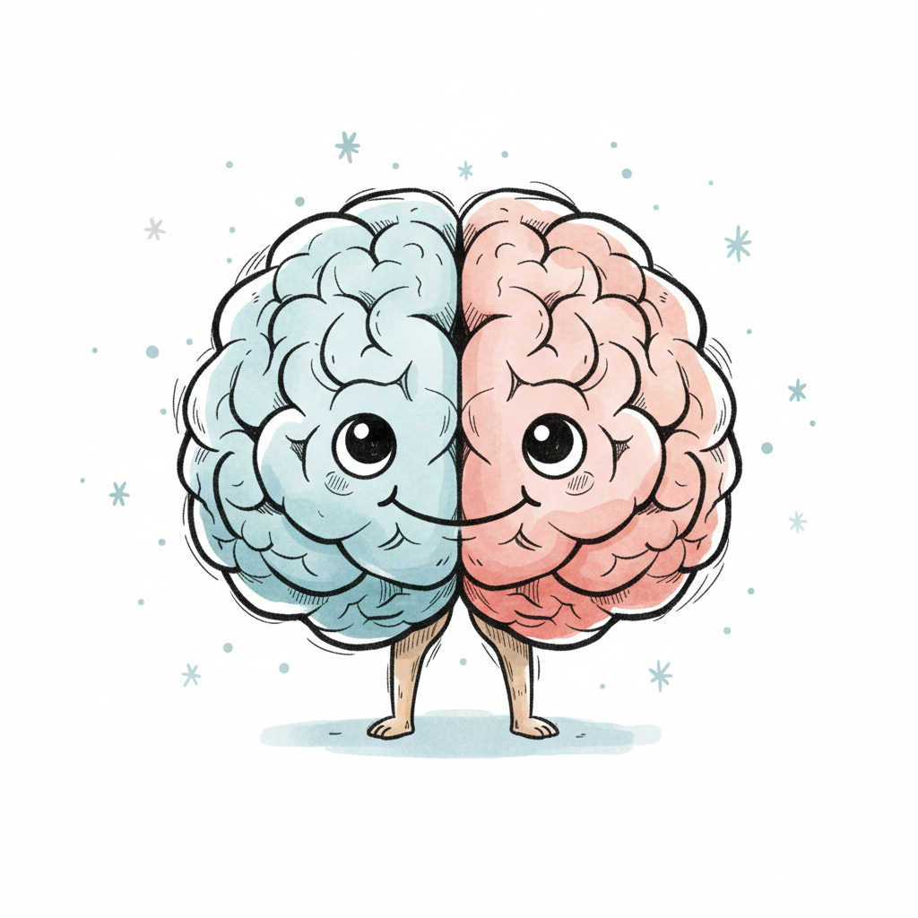 Niedliche Cartoon-Gehirnhälften mit Gesichtern und Beinen, eine blau, eine rosa, stehen zusammen.